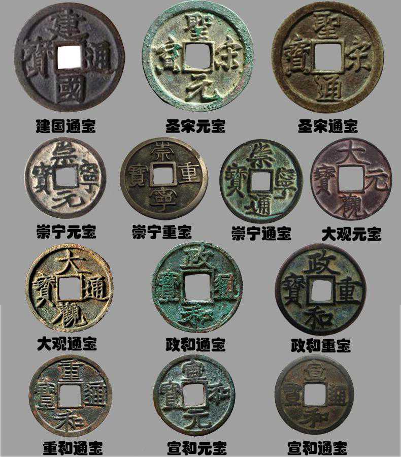 赵煦之后便是宋徽宗赵佶,赵佶在位25年,发行的钱币有"建国通宝"(1101年)、"圣宋元宝(通宝,1101年,非年号钱)"、"崇宁元宝(重宝、通宝,1102年)"、"大观元宝(通宝,1107年)"、"政和通宝(重宝,1111年)"、"重和通宝"(1118年)、"宣和元宝(通宝,1119年)"。