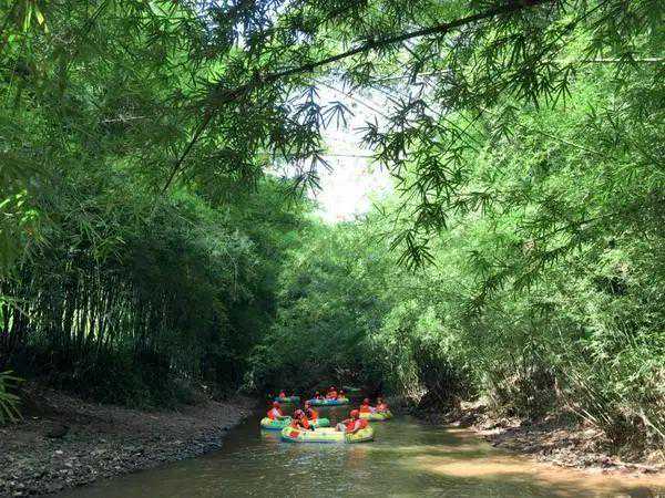 漂流和竹筏在一条河道上