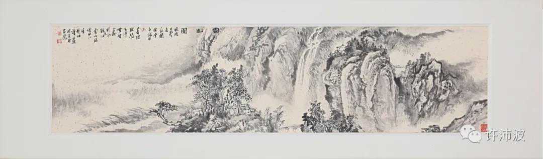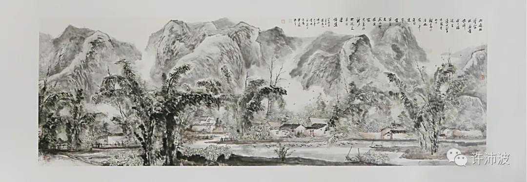 许沛波的画作既保留传统古法用笔,又有时代气息。做到构图简约、匠心独运、设色典雅、笔法灵动、布白考究、对比鲜明,给观者雄浑博大、跌宕起伏、高大深幽的美感。大小块面的巧妙组合和穿插,更勾动观者的心弦。远观气势磅礴,或危峰兀立、怪石嶙峋,或激流飞瀑、亭台楼阁,或流水人家、曲径通幽,再加上妙笔微展,干湿皴擦,略施浅绛便水汽氤氲,近看云雾飘渺,舒适宁静,简洁纯真的田园风景便展现在眼前!