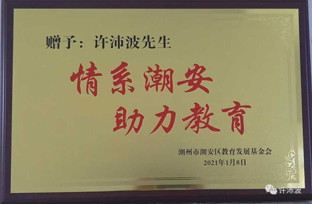 情系潮安,助力教育,惠泽桑梓,德传千秋。许沛波心系家乡教育,热心公益事业。其善举,体现了生于兹、长于兹,走出潮安、走向全国的艺术家高尚品德和社会责任担当,将带动更多社会各界人士为潮安教育奉献爱心,并激励广大师生奋力拼搏、争创潮安教育新辉煌!