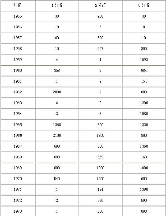 我国的第二套人民币首发于1955年,但是当时并没有发行硬币,硬币直到1957年才发行,这也是我国的首次面世的硬币,一共推出了3枚,面值分别是1分、2分和5分,其中首枚年份为1955年(虽然是1957年发行,但是日期是1955年第二套人民币推出的时间),材质为铝镁合金,该套硬币可谓流币中的常青树,60多年过去了,至今仍在流通,虽然说目前基本没有人有使用1分、2分、5分,但其仍然没有退出市场(一般如果退出流通,国家会发文,要求在居民在一定的期限内到银行兑换新币,否则后续不再回收)。