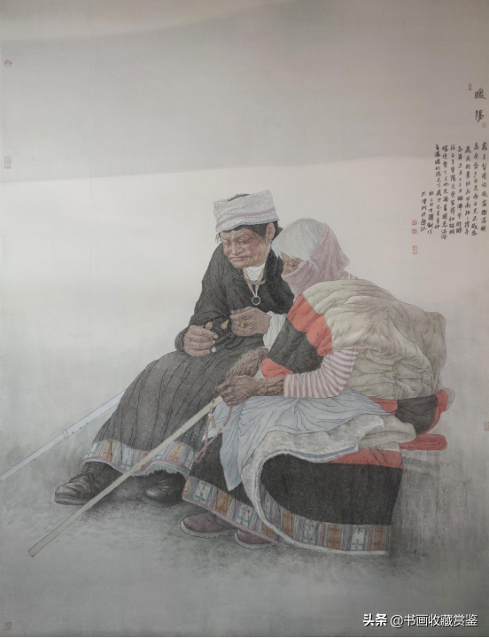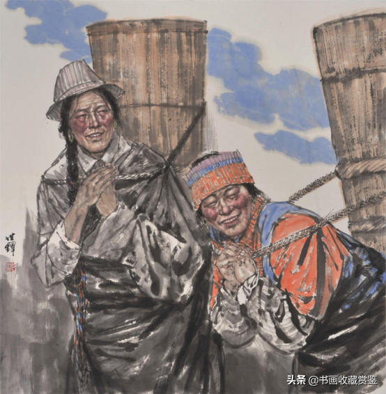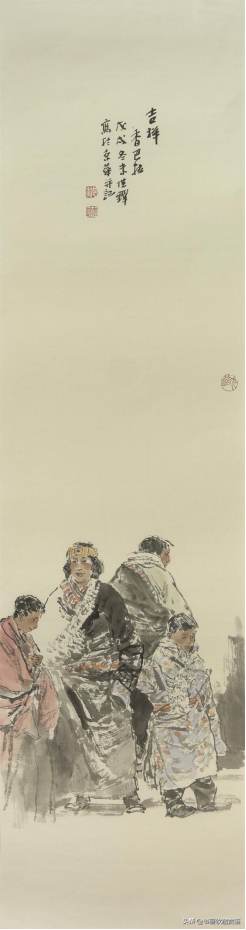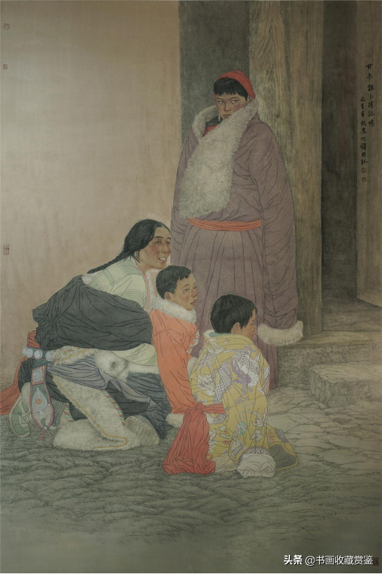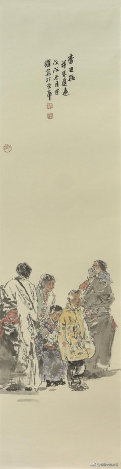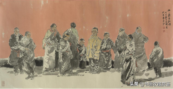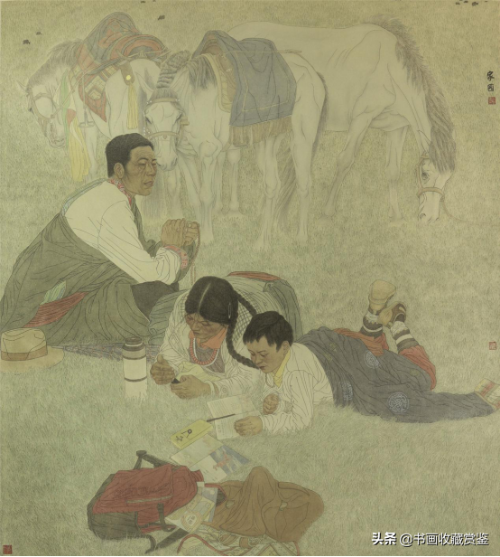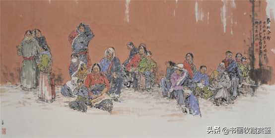 当然,这种内在情感与形式语言的紧密契合,在某种意义上与他常年深入西藏高原,描写西藏高原,从中感受那一片对宗教对艺术的虔诚的心境有关。在作品《春的企盼》中,红色的喇嘛庙墙外休憩的藏民,浓烈的红色衬托出藏民的一张张笃定、虔诚、淳朴的面孔,平淡却历久弥香。长卷中骑马的男子,围坐的家族,欢歌的人群,还有嬉戏的儿童,绿油油的草地上,把西藏纯净和完美,藏民虔诚和净化用其自己的语言描绘的淋漓尽致。当然,这不仅仅是对藏民的描绘,在我个人看来,更多是沈先生自我的一种寄予,一种理想抑或一种内心的独白。
