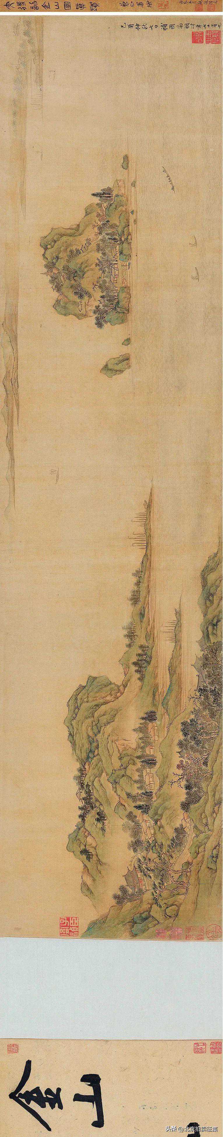 卷中《金山图》为文徵明于后一年己酉(1549)仲秋补图,此处年款作者误书为“时年七十有九”,应为80岁作。《金山图》以文雅秀逸的画风,描绘了金山一峰中立之奇境。图卷采用平远构图法,画中江水茫茫,微波荡漾,金山如浮玉飘浮在波涛之上。远处沙渚起伏,江上舟楫点点。山色青碧,上面有一栋栋画檐朱宇。巍然耸立在金山之巅的慈寿塔,更增添了金山寺的美丽秀色。在金山的东面,画镇江城郊一角,船桅、村舍、城墙隐现于山坳之间,意境开阔,引人入胜。
