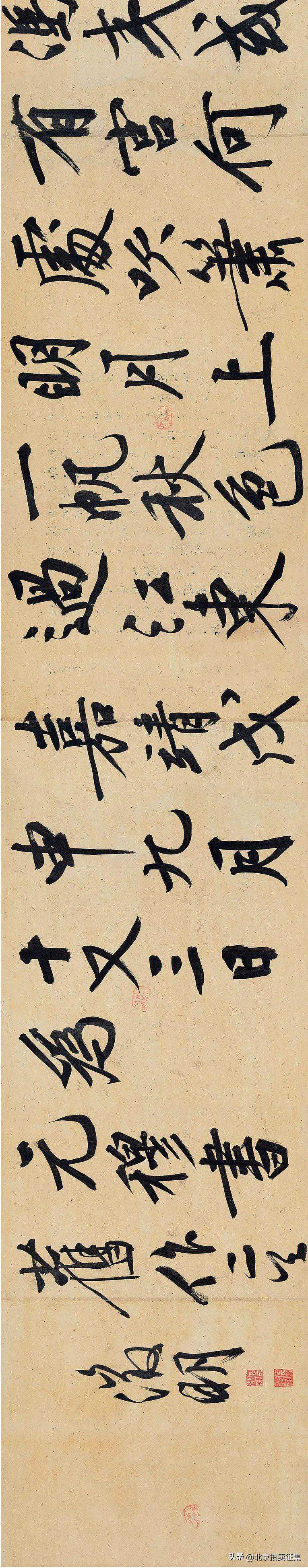 《金山诗画合璧卷》是文徵明书画合璧卷,书法部分长达五米多,以黄庭坚笔意写行书,每字如拳大。款云:“嘉靖戊申九月十又三日,为元穆书旧作二首。徵明。”可见书于1548年文徵明79岁时。