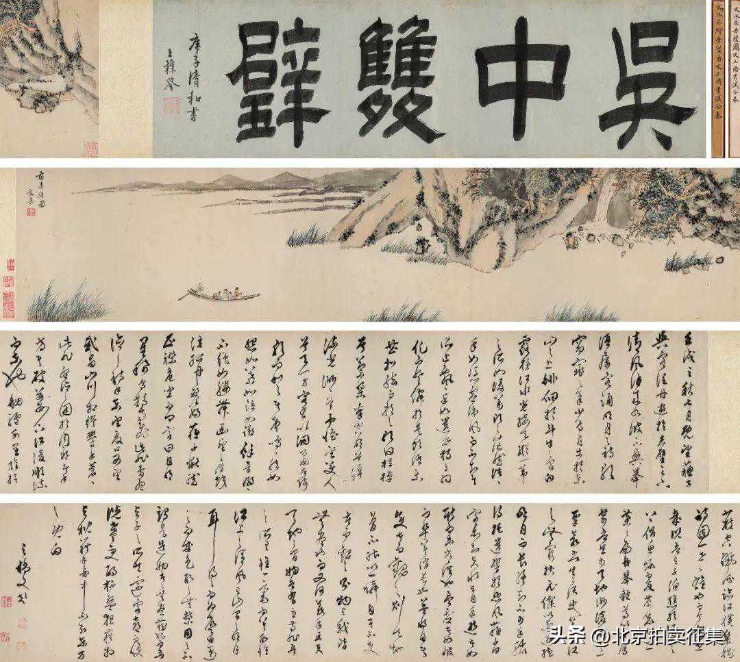 该手卷引首王稺登题大字隶书“吴中双璧”,为典型明中后期隶书风格。“吴中双璧”意既指此卷文彭之书、文嘉之画可称良璧,亦指文彭、文嘉兄弟二人皆为“璧人”。该卷无年款,钤文嘉之“文嘉休承”、“文水道人”二印,文彭“文彭之印”、“国子先生”二印,其中,文嘉之“文水道人”印参见上海博物馆藏1571年文嘉跋《祝允明草书李白诗卷》用印;文彭之“文彭之印”、“国子先生”印见于上海博物馆藏陆治、文彭1570年合作《赤壁赋书画合卷》文彭所书“后赤壁赋”用印。卷中文嘉《前赤壁图》部分可参见台北故宫博物院所藏文嘉于隆庆六年(1572)《赤壁图并书赋》卷,其中山石、林木画法颇多相合之处;