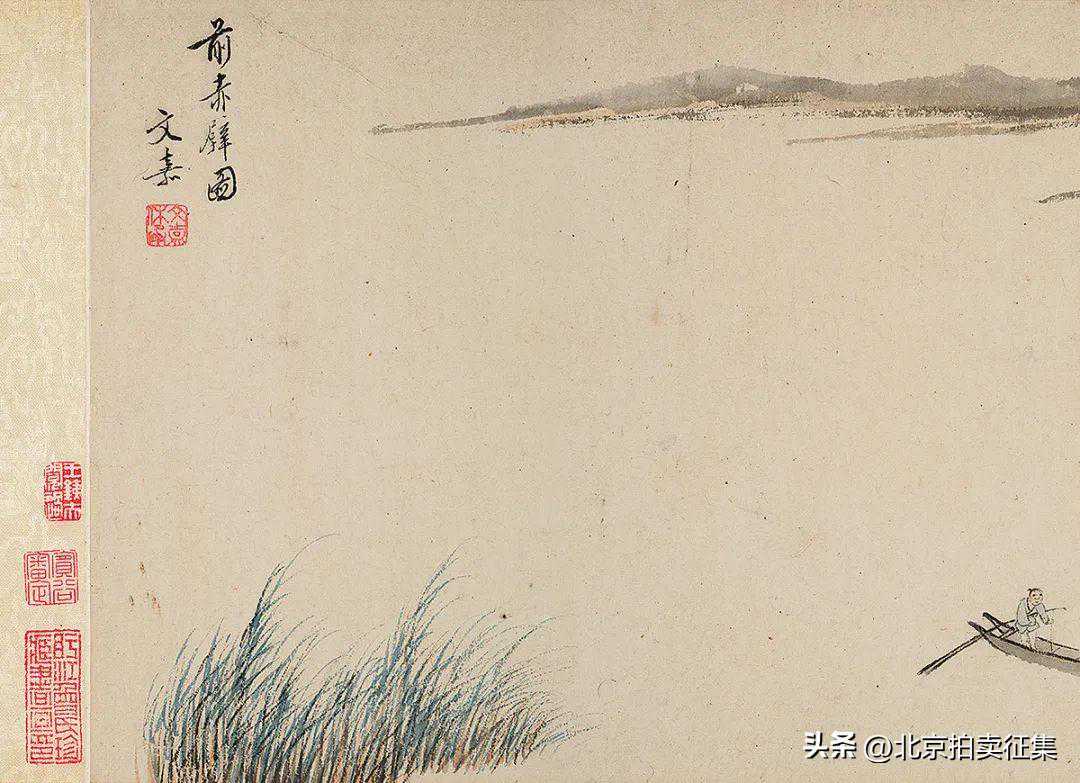 文氏兄弟于书画各有所长,文嘉写画,文彭书赋,可谓珠联璧合,且该卷又有王稺登题引首,亦可称“吴门三绝”。是卷以苏轼《前赤壁赋》为母题,将泛舟赤壁、举酒诵歌、清风徐来、水波不兴、白露芦苇、江上清风、山间明月等赋中文辞意象以笔墨写就,语意与画意交相辉映,诗画一律,天工清新。苏轼和赤壁在明代文人的视野中已经被经典化,赤壁赋的意象为后世文人提供了一种对待人生、安顿心灵、抚慰情感的模式。明代中叶以后的赤壁图,画面氛围更趋于宁静平和,反映的是江南文人的生活心境,他们更多地参与社会经济活动,其交往对象包含士、工、商等多个阶层,士大夫的书画活动更趋于商业化,市场上对艺术品的鉴藏品味也更趋于文人化,苏轼和赤壁赋题材广受欢迎,成为世人的心灵慰藉。