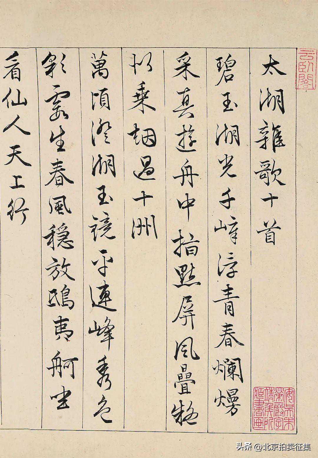 本卷画后陆师道为张元举书写的太湖杂歌十首,当为合璧。陆师道,字子传,人称五湖先生,长洲(今苏州)人。嘉靖十七年(1538)进士,历迁礼部郎中。以养母回乡,拜于文徵明门下,自称弟子。诗文书画兼擅,人称其得“文氏四绝”。观此卷书法,秉承文徵明平和端稳风格,运笔能化激厉为平静,无丝毫苟且,尽得文氏神采。张元举,字懋贤,号五湖,为吴县诸生,是文徵明弟子陈淳之外孙。张元举也擅画,得陈淳之法,善花鸟,气韵生动。
