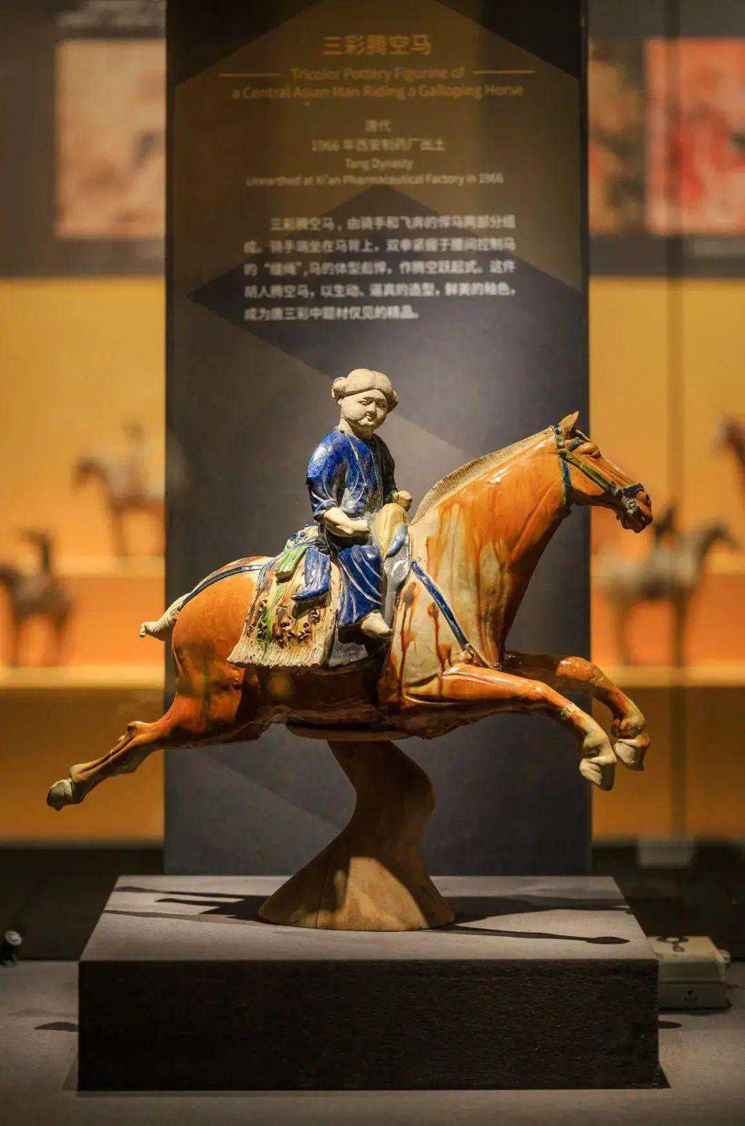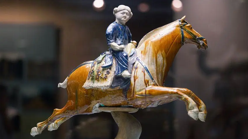 唐三彩是汉族古代陶瓷烧制工艺的珍品,属于一种盛行于唐代的低温铅釉的彩釉陶器,以黄、绿、白为基本釉色,1905年陇海铁路洛阳段修筑时,在洛阳北邙山发现一批唐代墓葬,后来人们习惯地把这类陶器称为“唐三彩”。唐三彩的诞生已有1300多年的历史了,它吸取了国画、雕塑等传统工艺美术的特点,采用堆贴、刻画等形式的装饰图案,线条粗犷有力。这件国宝的妙处就在于,唐三彩是汉族文化,匠人却特意精心塑造了胡人飞骑的生动形象。整器色彩华美,马匹丰腴,人物生动形象,体现了大唐文化的包容并蓄。