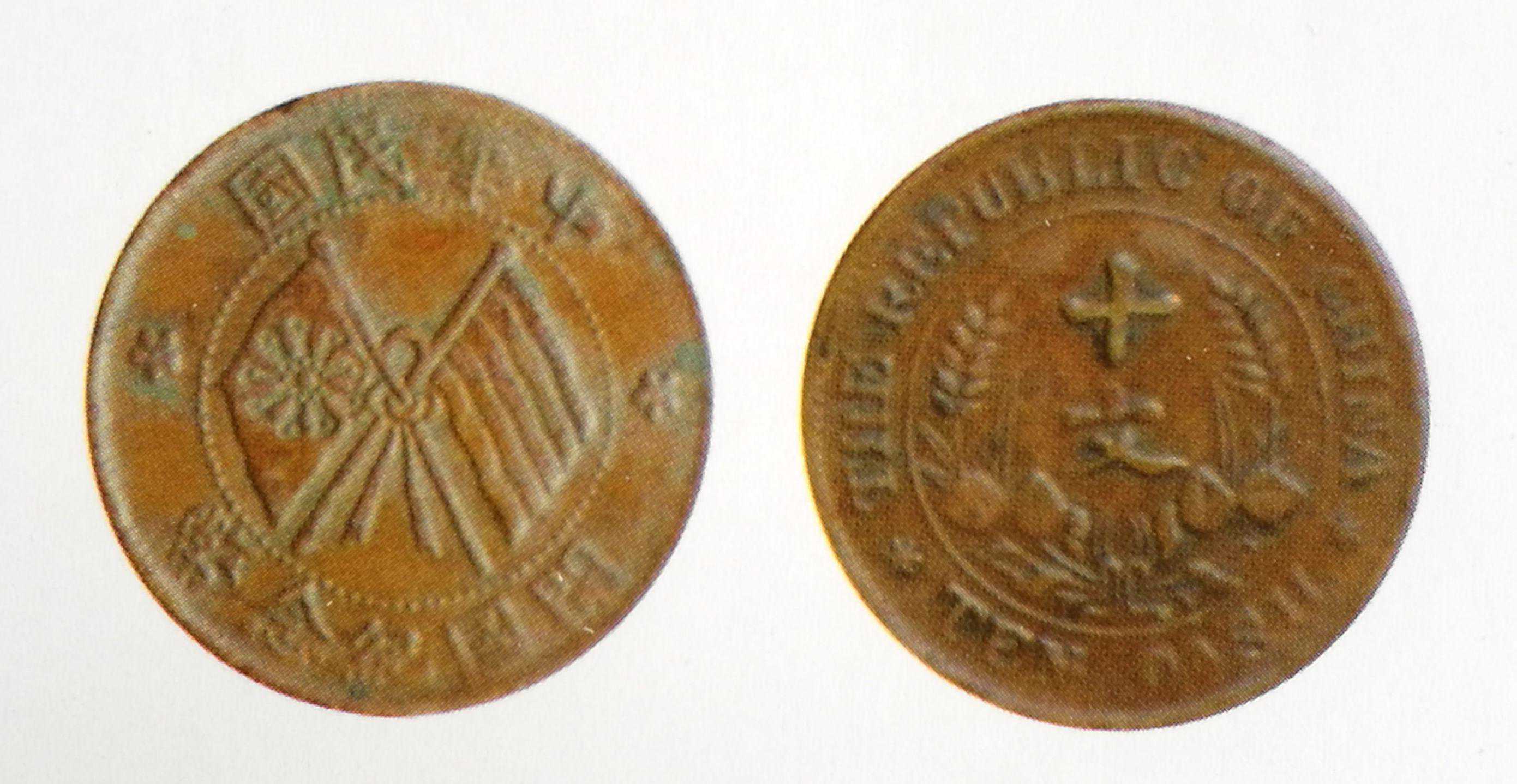 开国纪念币双旗十文,左旗上长空心点十八星星,较少品种,市场价上品40元。上图所示为美品,市场价150元。