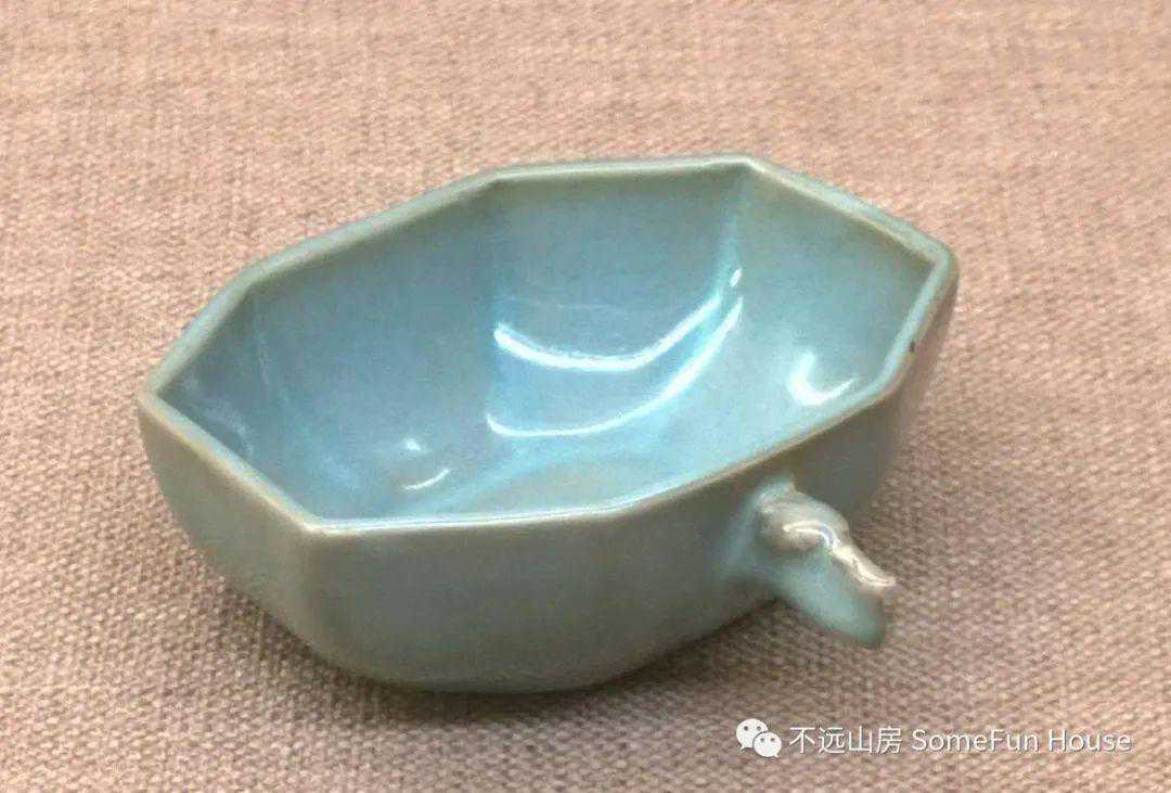河南博物院藏金代钧窑月白釉荷叶形单柄杯,金代,高5.9厘米,口径17厘米,1980年嵩县城关镇北街砖厂出土。体呈6瓣荷叶式,口部微敛。口部一侧出葵式折沿,沿下附耳,耳与腹部相连。通体施月白釉,满釉支烧,底部有三支烧痕。