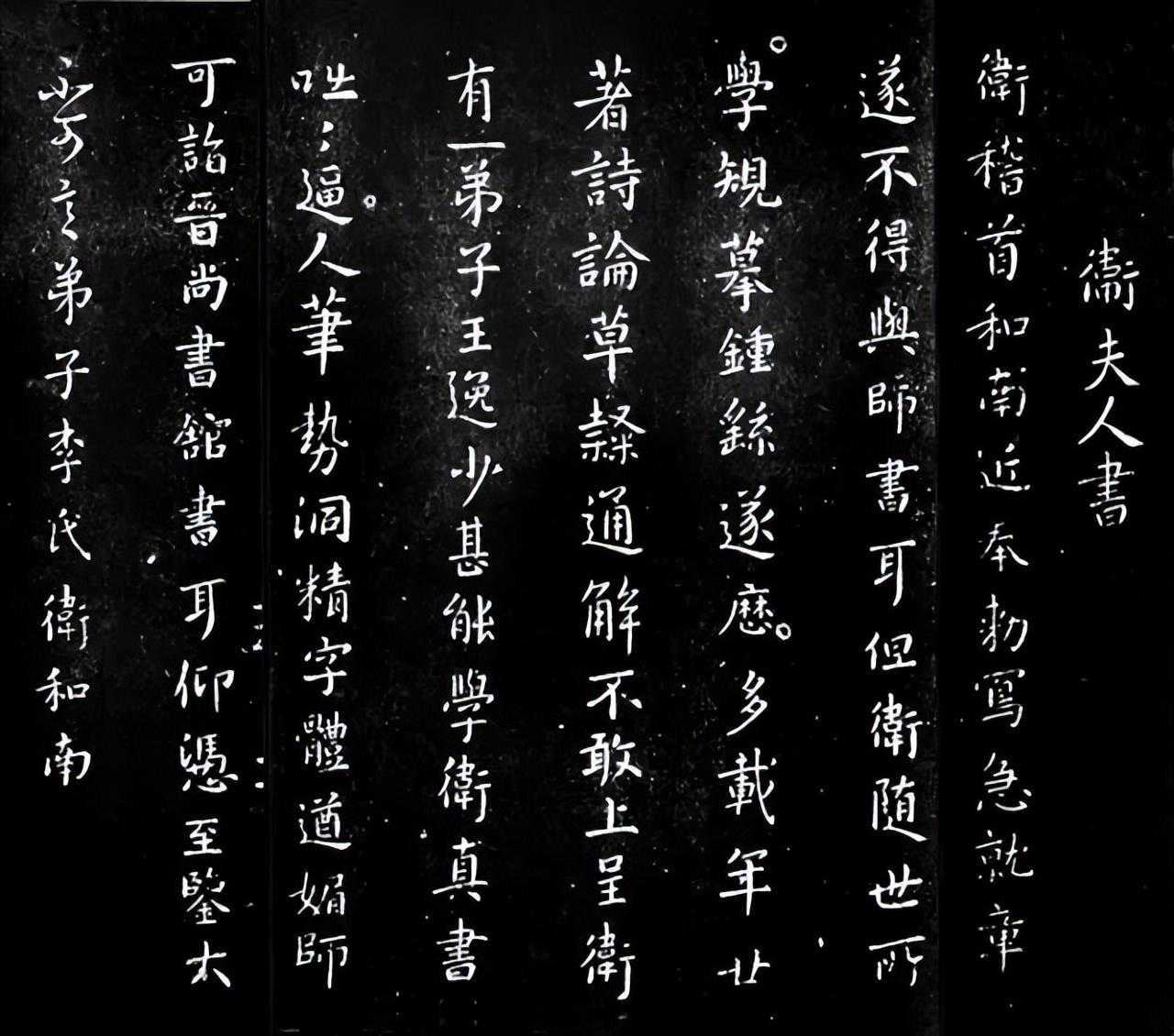 卫夫人,名铄,字茂猗(公元272-349年),河东安邑(今山西夏县北)人,汝阴太守李矩之妻,东晋著名女书法家。族祖卫瓘,官至西晋司空,录尚书事,与索靖俱善草书,人称“一台二妙”。卫氏家族世代工书,卫铄师承钟繇,妙传其法,以为楷书订定笔划顺序而闻名。王羲之少时曾从其学书,卫夫人是“书圣”的启蒙老师。
