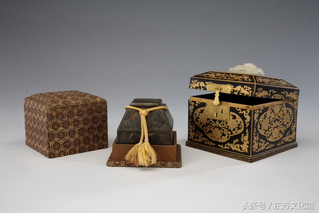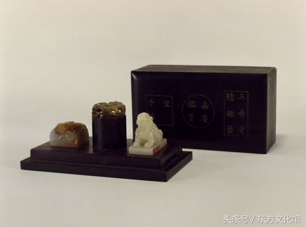 “三希堂精鉴玺”组玺,清乾隆,二方一组,其中“三希堂精鉴玺”,青玉质,螭纽长方形玺,汉文篆书。面宽2.2cm,长4cm,通高1.9cm,纽高1cm;“宜子孙”,汉玉质,瓦纽方形玺,汉文篆书。面2.5cm见方,通高1.5cm,纽高0.8cm。