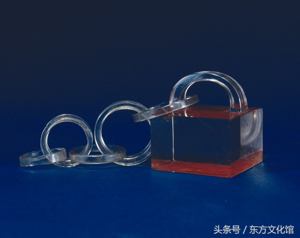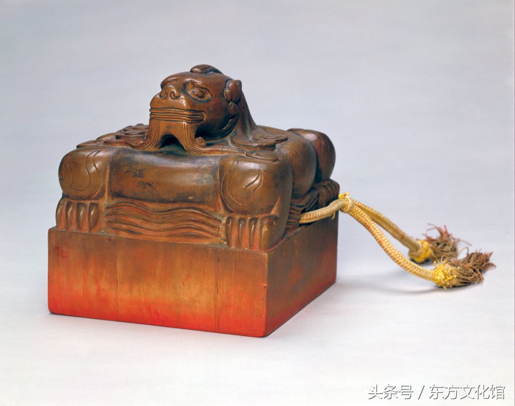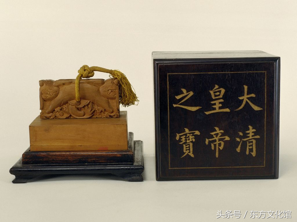 同治帝宝玺。此宝用一块水晶雕制,尤其是桥纽及连环,雕刻难度很大,不易成型,故十分难得。此宝曾钤于慈安皇太后、慈禧太后《行乐图》以及咸丰帝定陵神道碑之上。