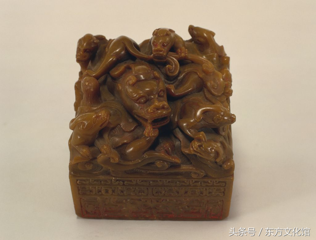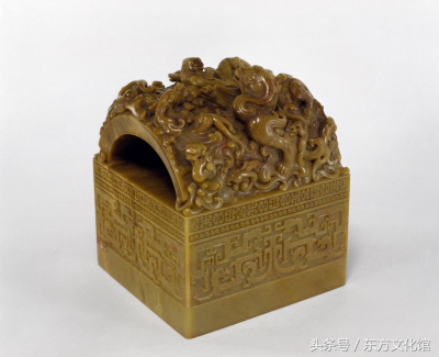 “乾隆敕命之宝”,清乾隆,寿山石质,螭纽方形玺,汉文篆书。面13.3cm见方,通高13.4cm,纽高5cm。