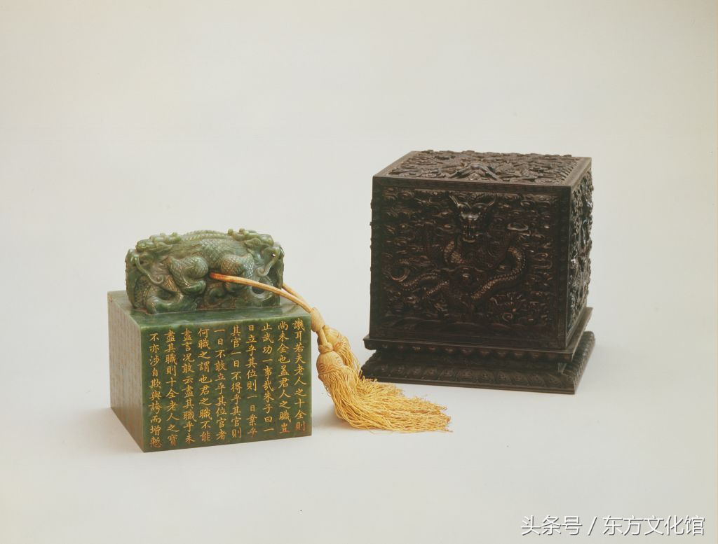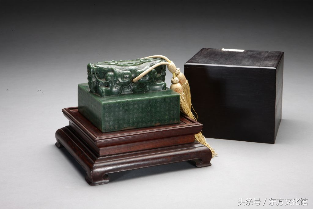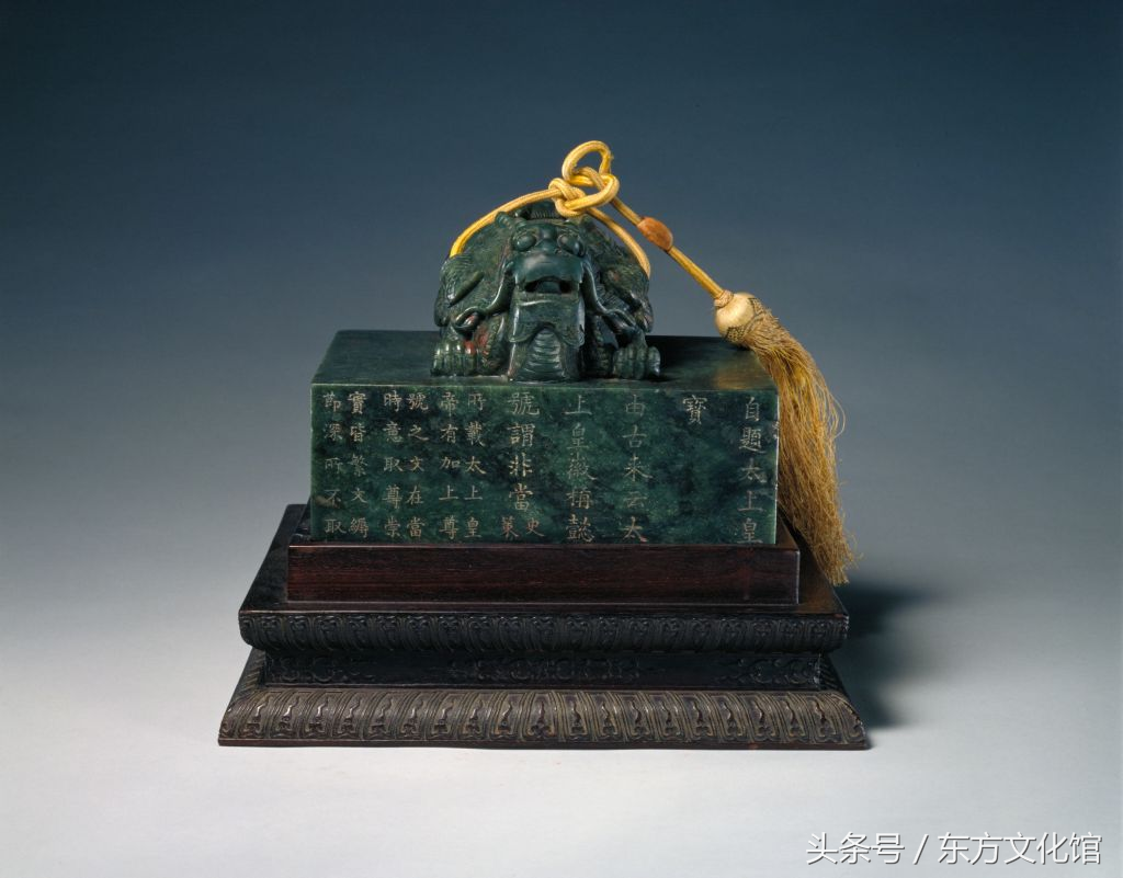 “十全老人之宝”,清乾隆,碧玉质,交龙纽方形玺,汉文篆书。面12.8cm见方,通高15.3cm,纽高5.4cm。
