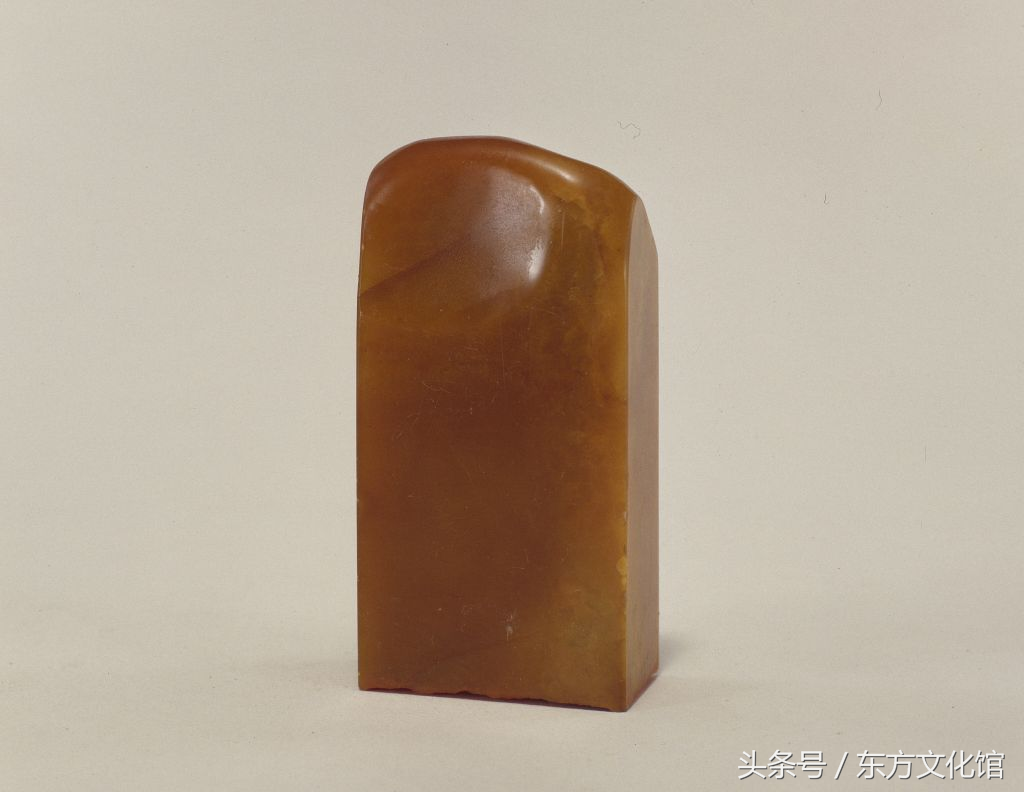 “三希堂”玺,清乾隆,田黄石质,光素随形长方形玺,汉文篆书。面宽2.3cm,长4.2cm,通高8.5cm。