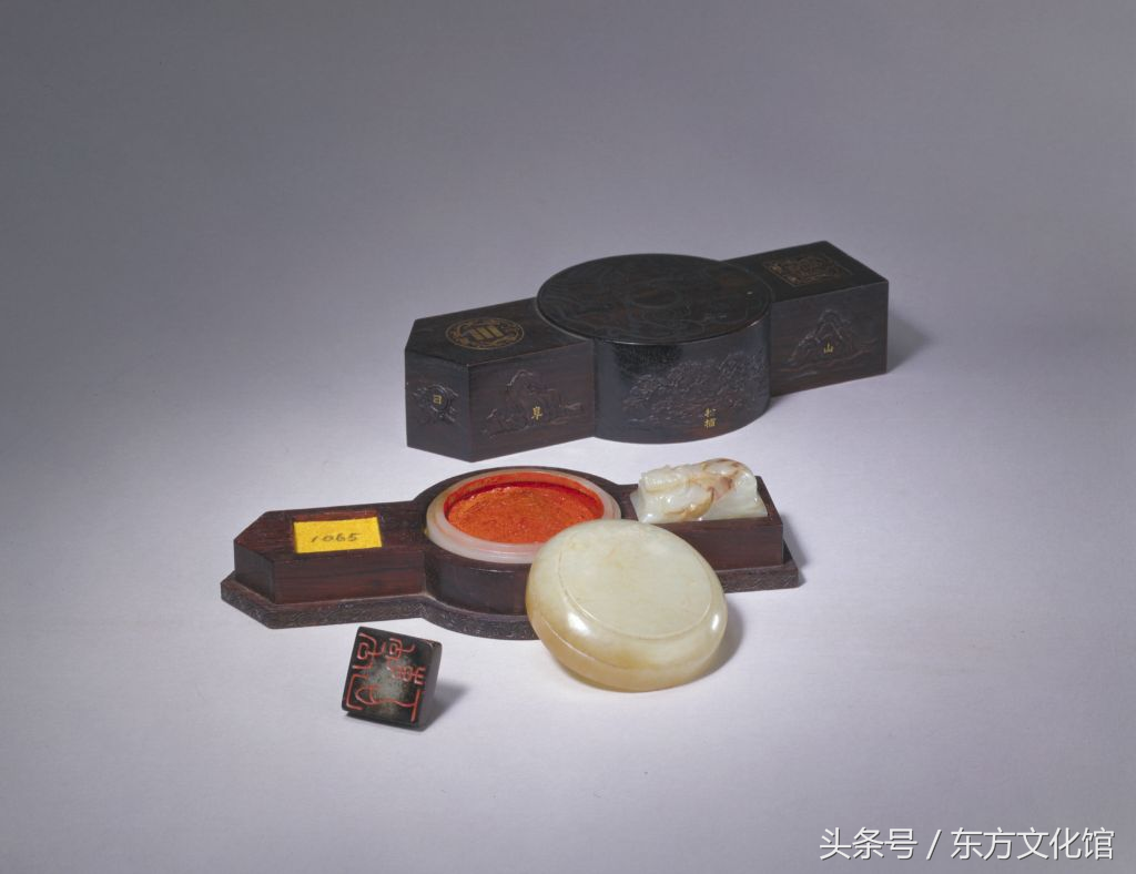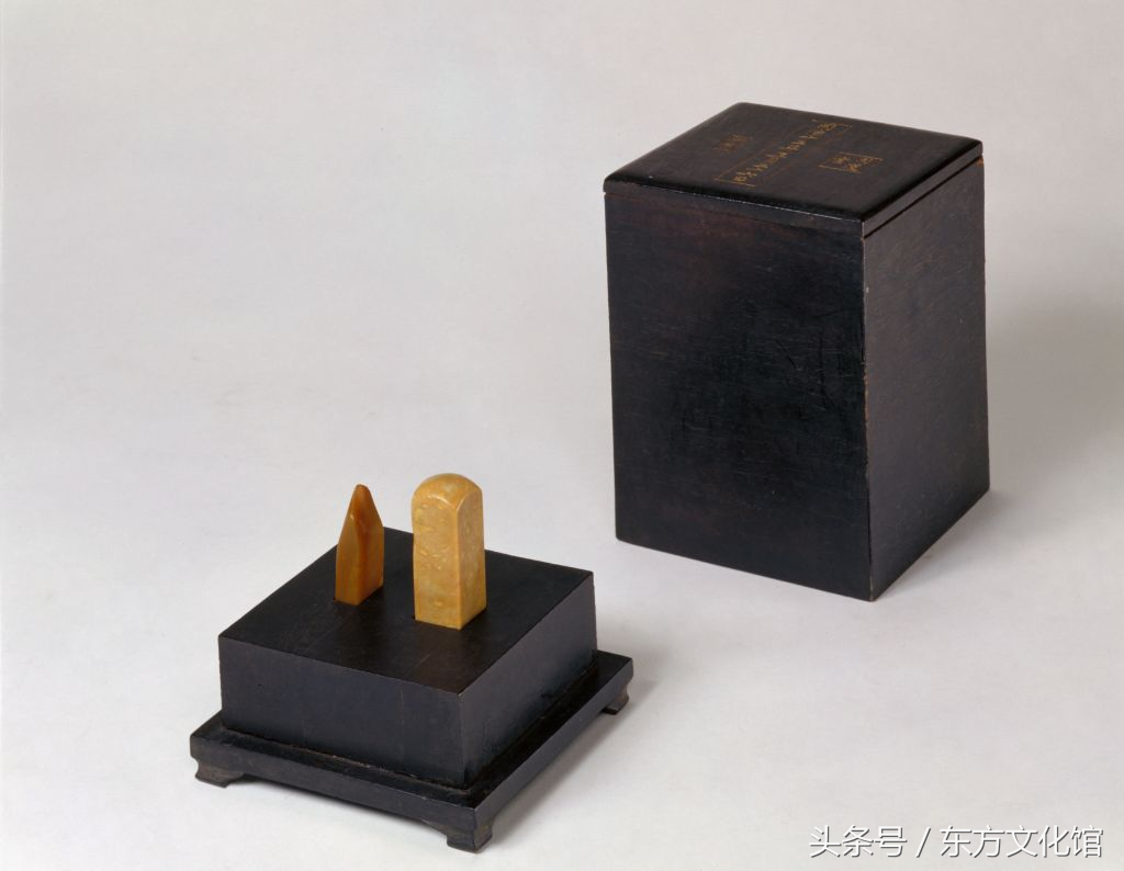 “同道堂、御赏”玺,清咸丰,二方一组,共装于一黑漆盒内。其中“同道堂”玺,青田石质,光素,篆书。面2cm见方,通高8cm。“御赏”玺,田黄石质,光素,篆书。面宽1cm,长2cm,通高5cm。