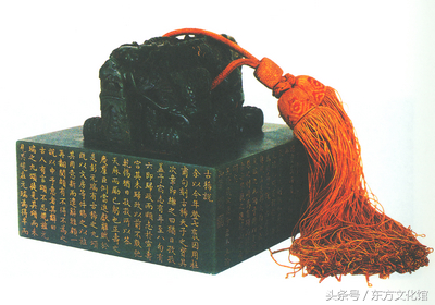 “奉天法祖亲贤爱民”玺,清早期,墨玉质,交龙纽方形玺,汉文篆书满文玺书体。面15.6cm见方,通高9.8cm,纽高4.9cm。附系黄色绶带及牙牌,牙牌两面分书满汉字“奉天法祖亲贤爱民宝匮”。