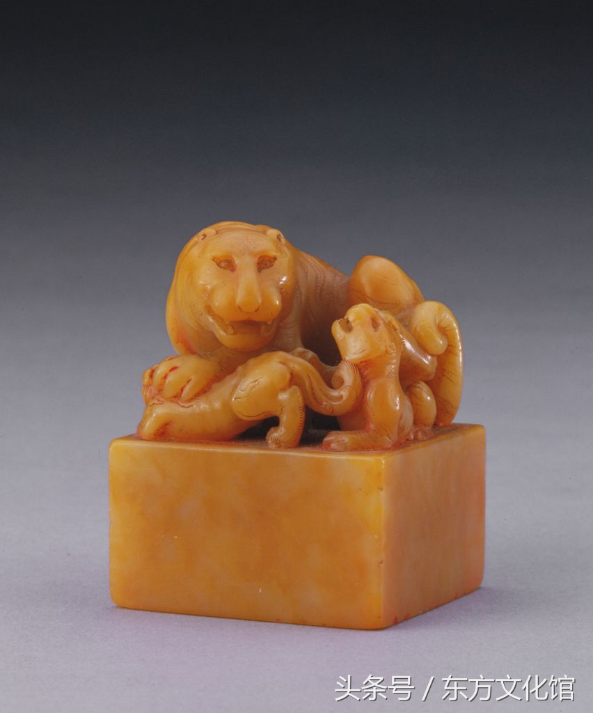 “乾隆御笔”玺,清乾隆,田黄石质,子母狮纽方形玺,汉文篆书。面4.7cm见方,通高6.2cm,纽高3.5cm。