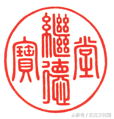 “继德堂宝”,清嘉庆,青玉质,双螭纽,汉文篆书。面圆形,径6.8cm,通高5.5cm,纽高2.1cm。宝用檀香木八方匣盛装。