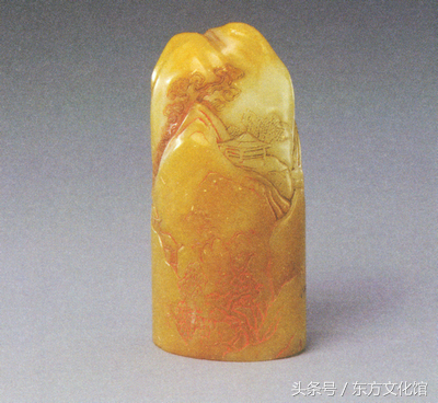“嘉庆御览之宝”,清嘉庆,寿山石质,随形雕山水小景长方形玺,汉文篆书。面长4.3cm,宽3.1cm,通高8.5cm。