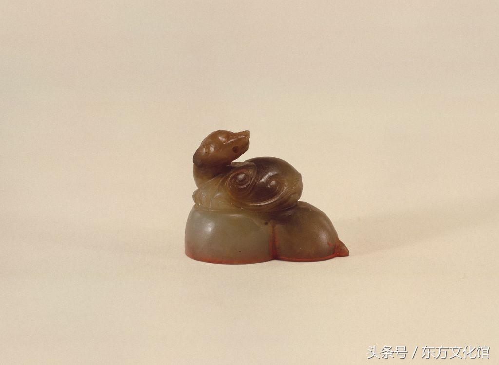 “为君难”雕螭长方石印,清雍正,寿山石质。印面最宽5cm,长8.5cm;印体宽5.2cm,长8.6cm,通高4.5cm,纽高0.2cm。