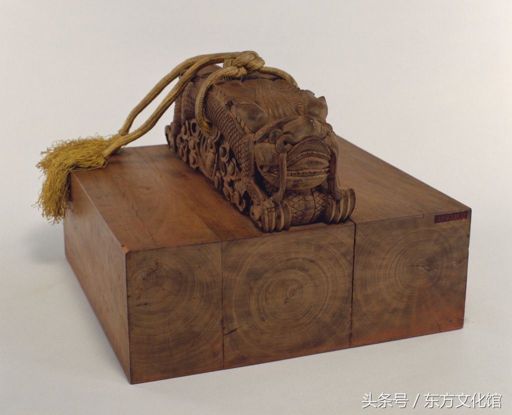 “慈禧太后御笔之宝”,清晚期,檀香木质,交龙纽方形玺,汉文篆书。面25.3cm见方,通高16.7cm,纽高7.3cm。附系黄色绶带。