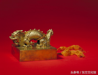 “天子之宝”,清早期,金质,交龙纽方形玺,满文篆书。面11.9cm见方,通高8.3cm,纽高5.1cm。附系黄色绶带及牙牌,牙牌两面分书满汉字“天子之宝匮”。