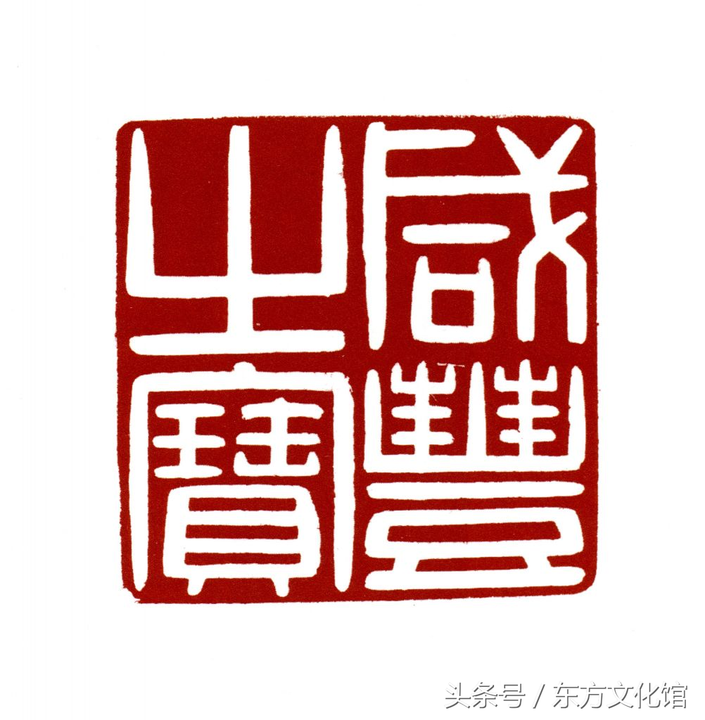此种圆形“××鉴赏”玺的刻制始于乾隆帝,以后历朝皇帝皆有仿制,主要钤盖于内府收藏书画。咸丰帝此玺的印纽雕工为清早期寿山石印纽的风格,应是利用旧玺改刻的。