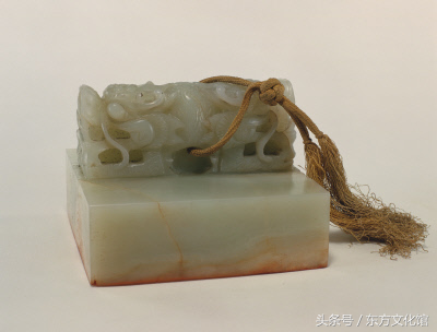 “传心基命”玺,清嘉庆,青玉质,云龙纽方形玺,汉文篆书。面4.1cm见方,通高7.3cm,纽高3.1cm。