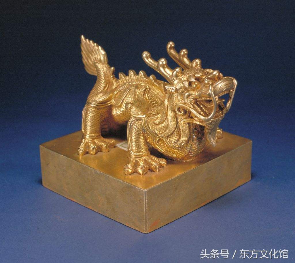 “珣皇贵妃之宝”,清宣统,金质,蹲龙纽方形玺,满汉文篆书。面13cm见方,通高12.8cm,纽高4.1cm。