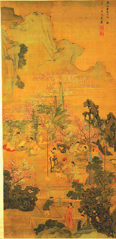 此外,故宫博物院藏《春泉小隐图》是明代周臣为一位号“春泉”的裴姓文人所作的“别号图”,描绘了他幽居小憩的情景,反映出明代吴门山水画丰富立体的社会文化功能;天津博物馆藏《盥手观花图》以女子回眸串联镜台与牡丹,营造出“人面牡丹相映红”的意境;浙江省博物馆藏《西山爽气图》是明代张宏晚年用时一个多月绘成的长卷,写实地描绘了明朝苏州西山夏季的自然景色,作者学古人摄心调气法,希望通过画清凉世界以消酷暑;苏州博物馆所藏清代张崟《临顿新居第三图》,描绘了江南私家园林曲廊遮护、青桐高引、梅竹繁密、亭台楼阁隐现其中的图景;旅顺博物馆藏清代吕焕成《春夜宴桃李园图》,取材于李白的《春夜宴桃李园序》,作者把人物画和青绿山水结合,从氛围入手,描绘了夜宴开始时的场景,极富浪漫诗意。