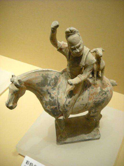 唐代彩绘胡人骑马带犬狩猎陶俑
