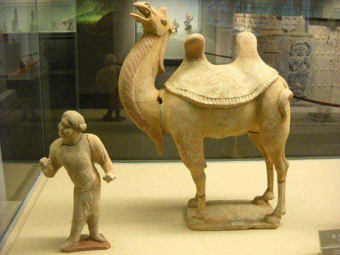 唐代彩绘牵驼俑与骆驼
