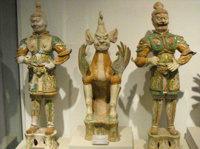 由于天王俑在墓中具有独特的作用,制作上也较精细,体量也较人物俑、动物俑大。彩绘三彩釉天王陶俑身穿铠甲,左手杈腰,右手高举,足下踏一跪着小鬼,它体现了主人希望阴间太平,不受鬼神侵扰的心愿。