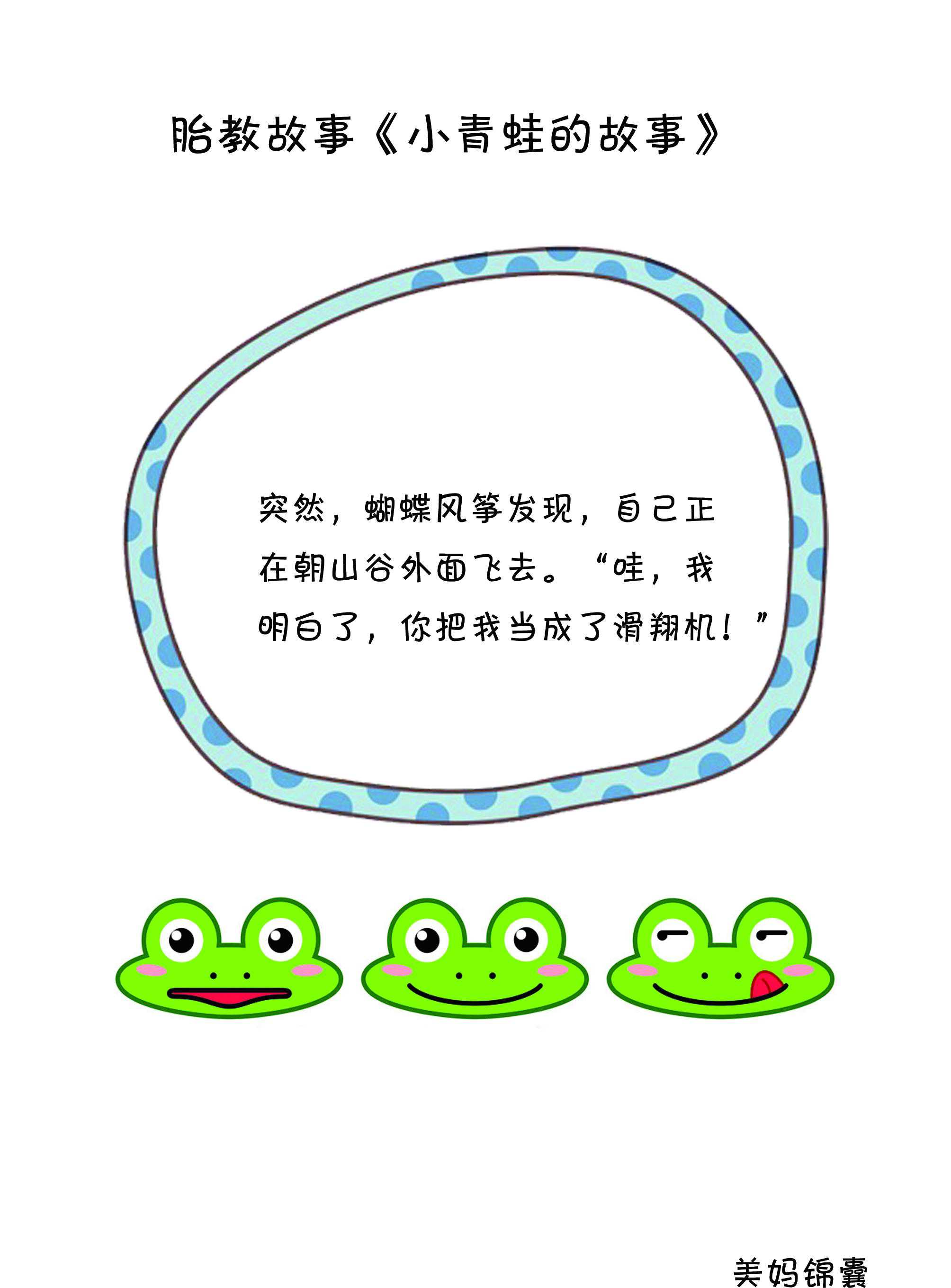 有一天,小青蛙爬上了一座高高的悬崖,悬崖下面,是深深的山谷。突然,小青蛙发现,山谷里有一只蝴蝶风筝,她正被风吹得转来转去。当风筝被风吹到小青蛙身边时,她大喊:“帮帮我,我想停下来!”小青蛙睁大眼睛仔细看,终于看到了风筝下面的细线,可是,他还没来得及伸出手,风筝又被风吹跑了。风筝在山谷里转了一圈,又被风吹到了小青蛙面前,“快,拽住我的绳子!”这回,小青蛙的动作快极了,一下抓住了蝴蝶风筝的绳子。