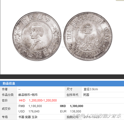 众所周知,2016年是纪念孙中山先生诞辰150周年,显而易见与孙中山题材相关的银元有很大的纪念价值,也赢得了广大收藏家的喜爱。其中孙小头开国纪念币银元价格飞涨,在15年突破前期新高高达280万。