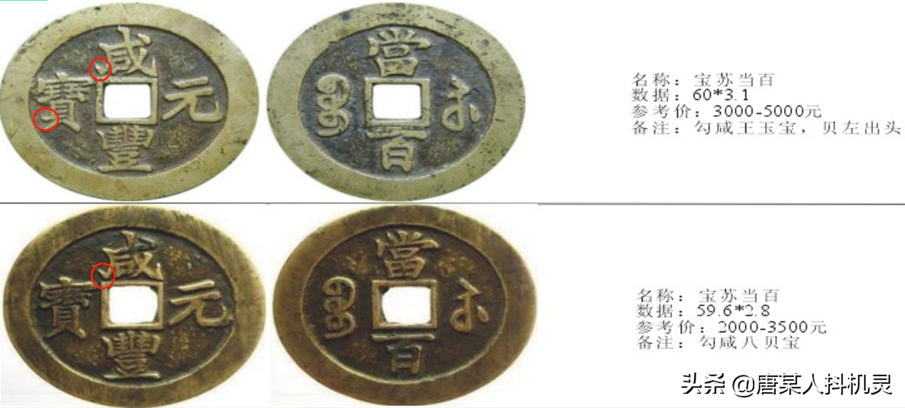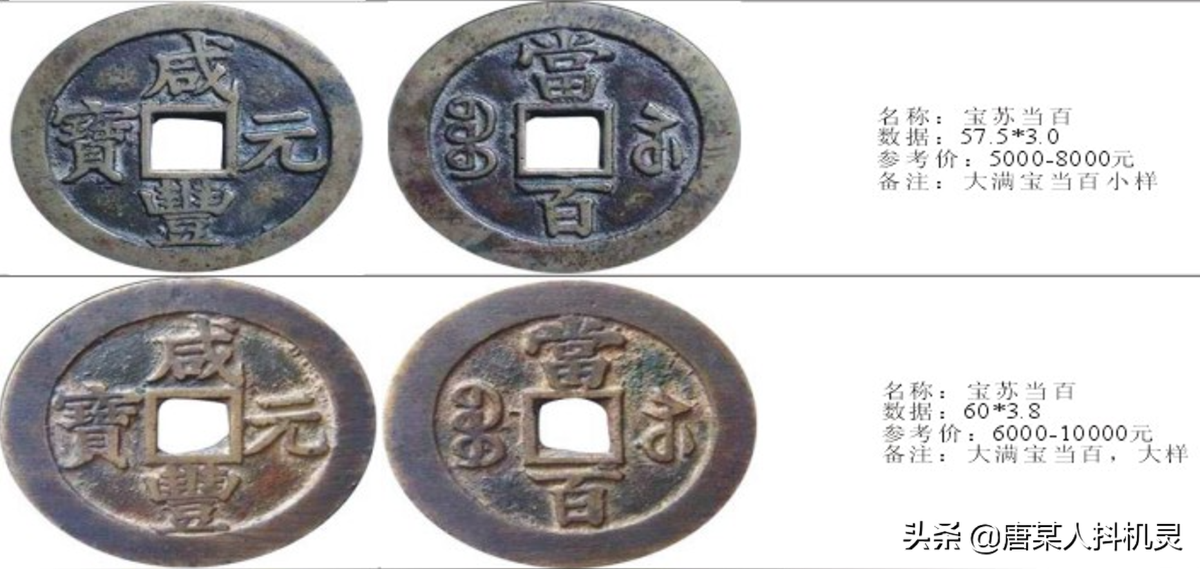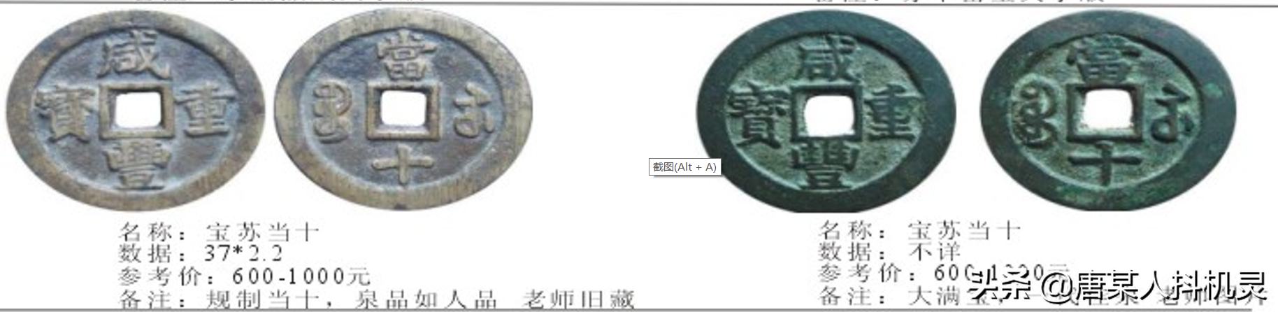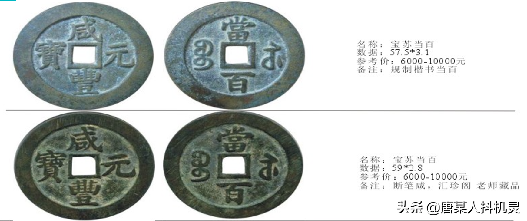 当百,宝苏当百也是所有当百中相对多见的,而且版本不少。在宝苏咸丰钱中有一类版本因咸字左下尾部是否勾起而分为“撇咸”和“勾咸”。