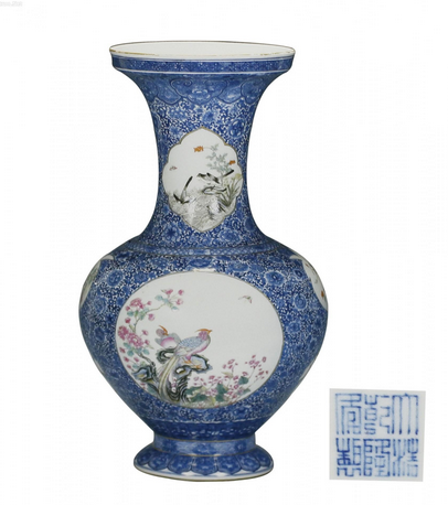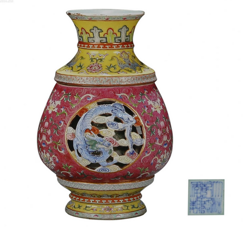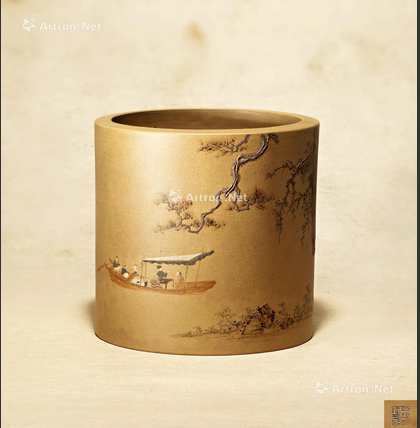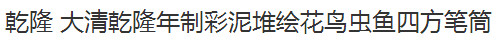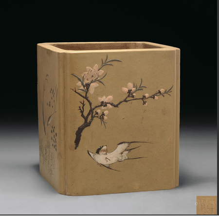 方形笔筒,倭角内收,制作规整周正。器身以宜兴本山绿泥为体,敷以嫩黄泥为表,彩色泥绘并堆砌于外壁。笔筒四面分别饰以桃花飞燕、萍藻游鱼、红蓼螳螂、秋花蜻蜓等四季景物,画面清丽秀雅,有新罗山人的绘画风格。全器用料考究、画意隽永、画工精湛,为乾隆御用紫砂文房佳器。圈足内藏,器底中心钤印两行六字“大清乾隆年制”篆书阳文款。