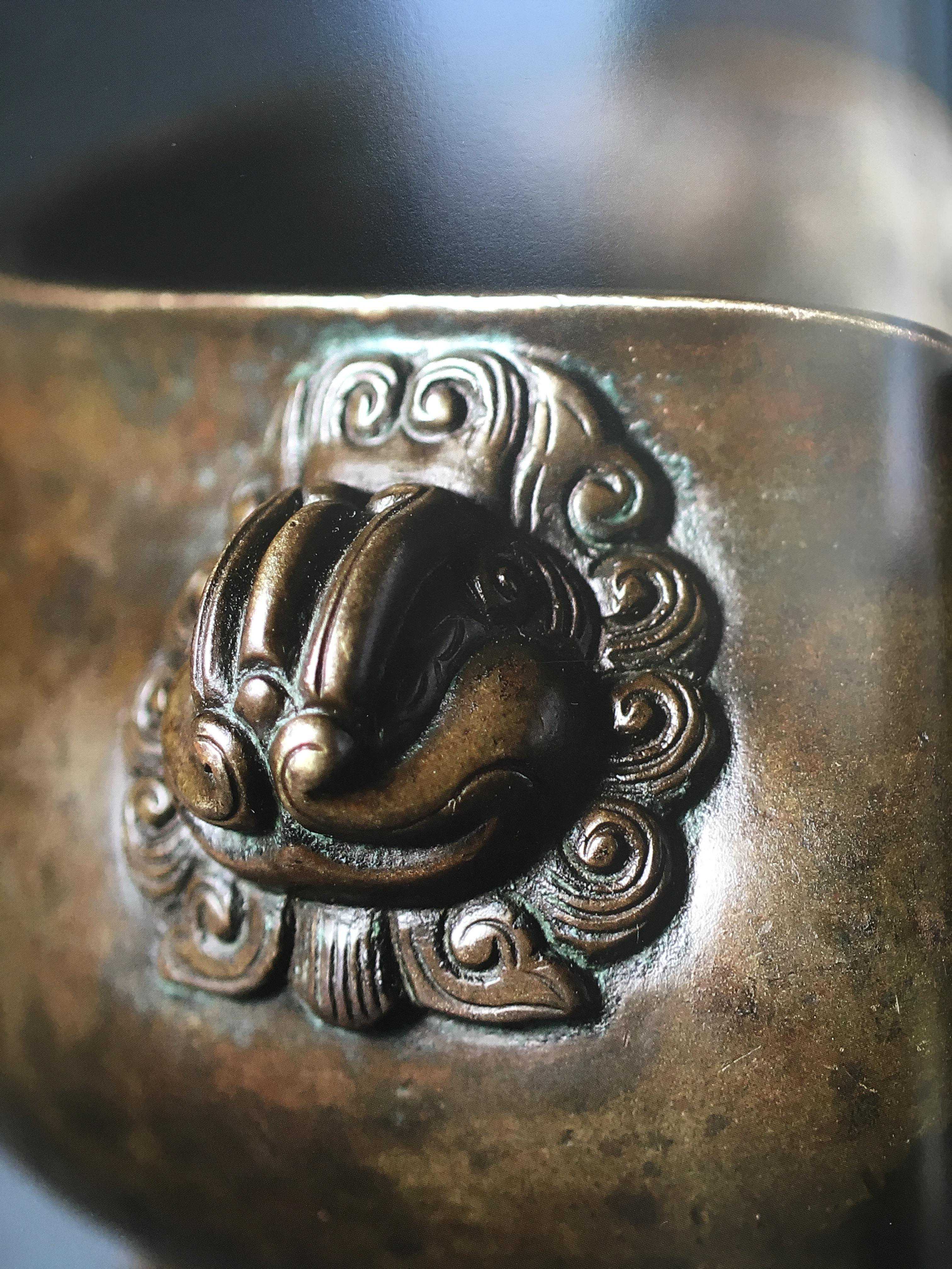 炉身形状与蚰蜒耳炉相似,炉耳塑狮首而得名,《宣德鼎彝谱》中有载,狮耳炉为宣德年间御赐兵部尚书及大都督等军职人员之器型,取其威猛之意。有文殊菩萨坐骑,故狮头炉适宜供养。那么这段文字也基本就说明了他的使用用途和位置,时至今日很多爱好此道的朋友孔武有力者,问笔者应选何种宣德彝炉笔者依旧推荐此款,同其他宣德炉耳一样,狮耳炉也有造型上的变化,可用于参考判别年代。