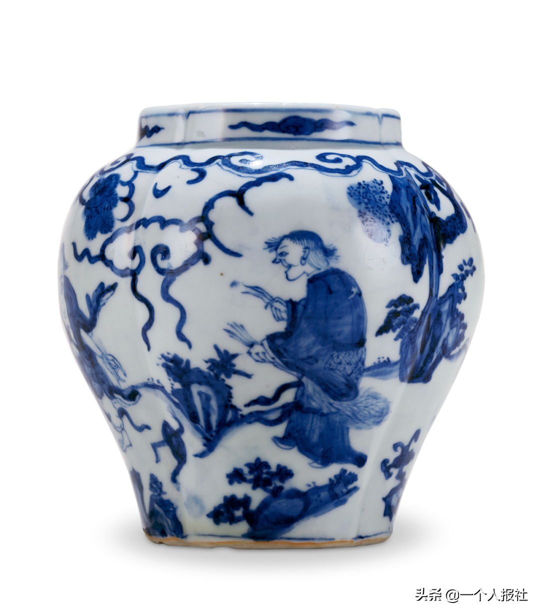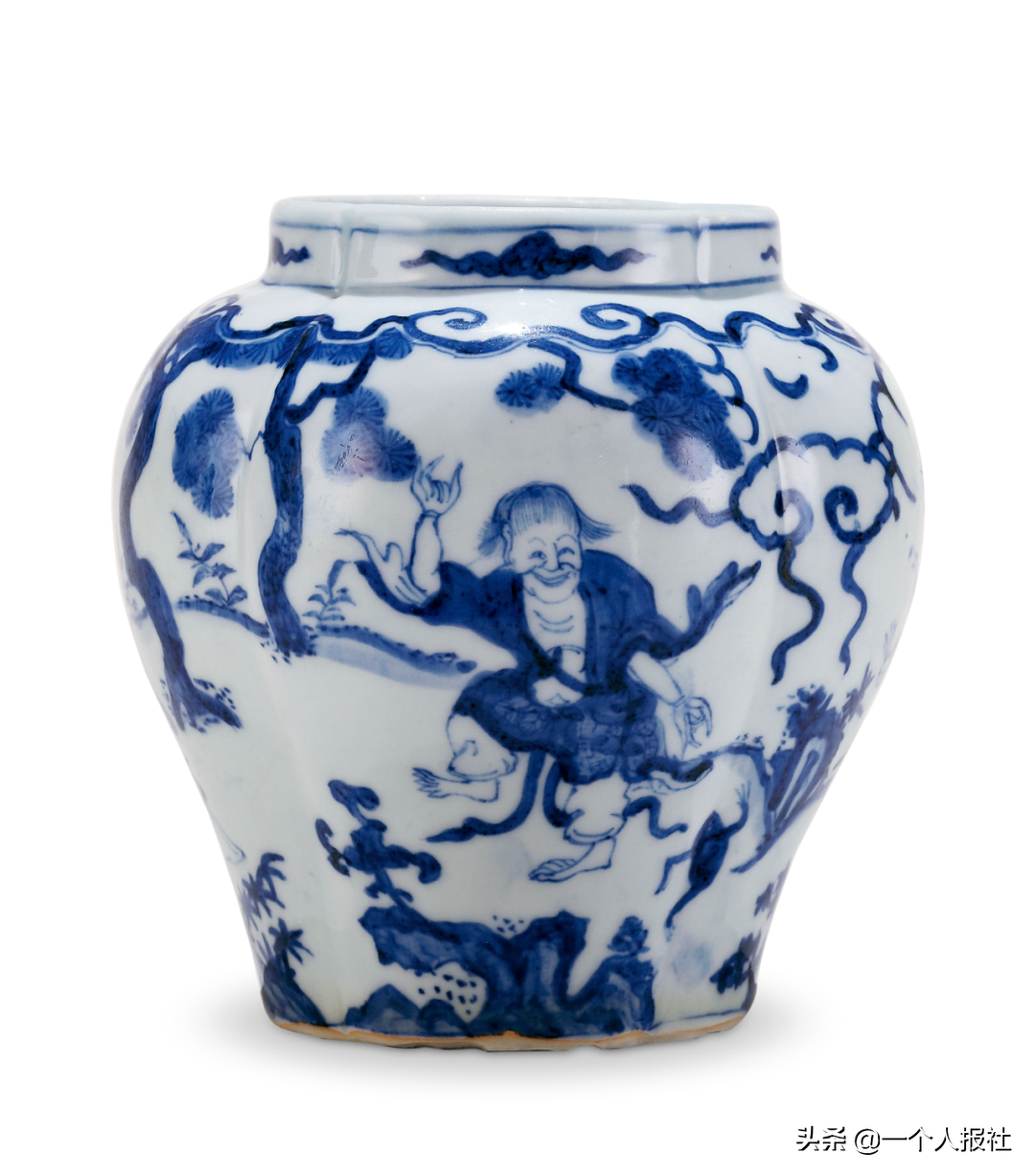 明嘉靖青花四仙花口罐