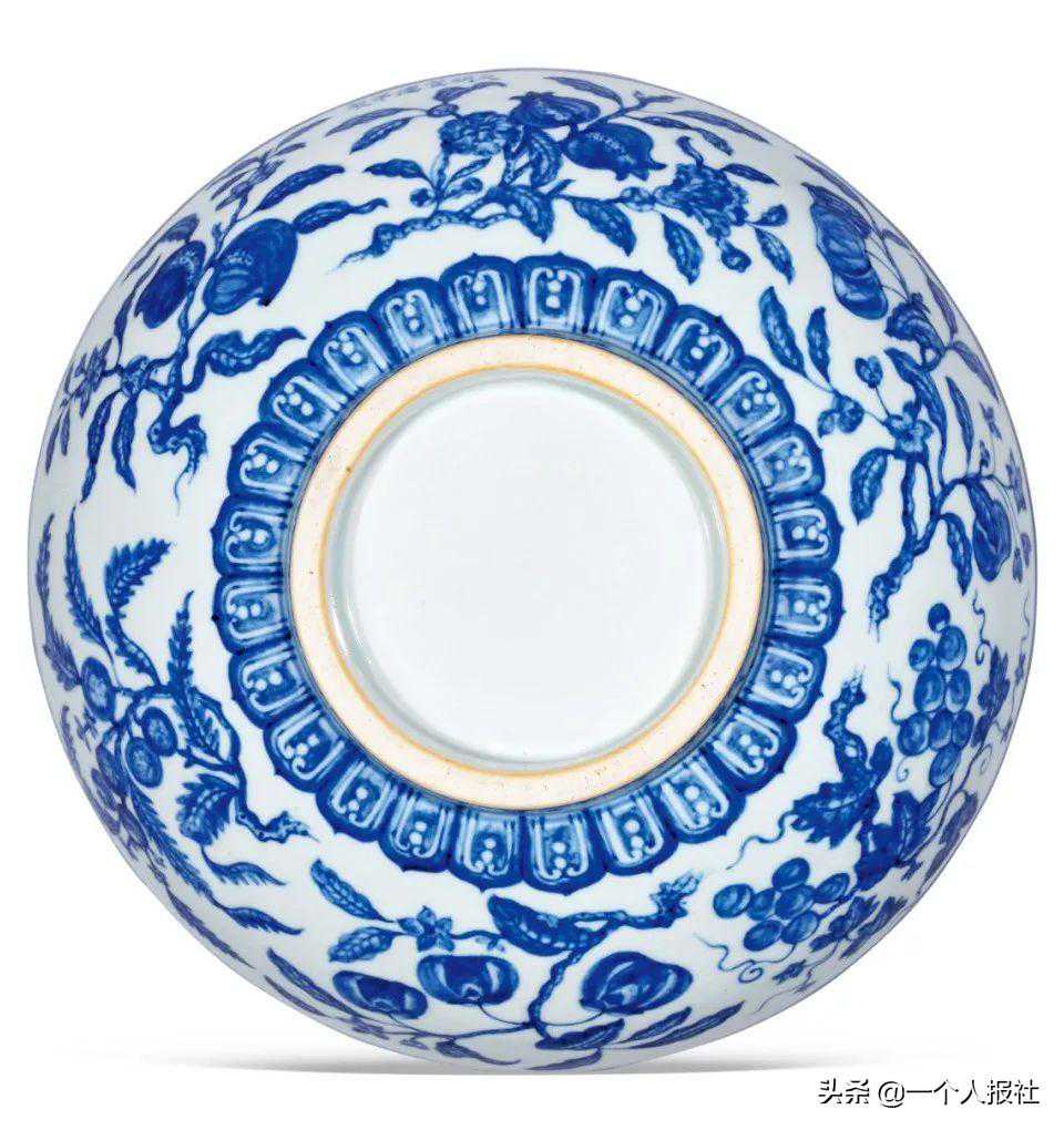本品器内素面无纹,器外纹样以青花为饰,圈足侧墙以梅花装饰,疏朗别致。胎体厚重,釉质细腻,内施白釉,外壁通体青花装饰,口沿绘青花弦纹两道,腹部绘六组折枝花果纹,石榴、寿桃、荔枝、柿子、枇杷、葡萄等,寓“多子多寿”之美意。近足处绘莲瓣纹一周,圈足处绘花朵纹。外口沿下青花横书“大明宣德年制”六字楷书款,为此式大碗统一的装饰。