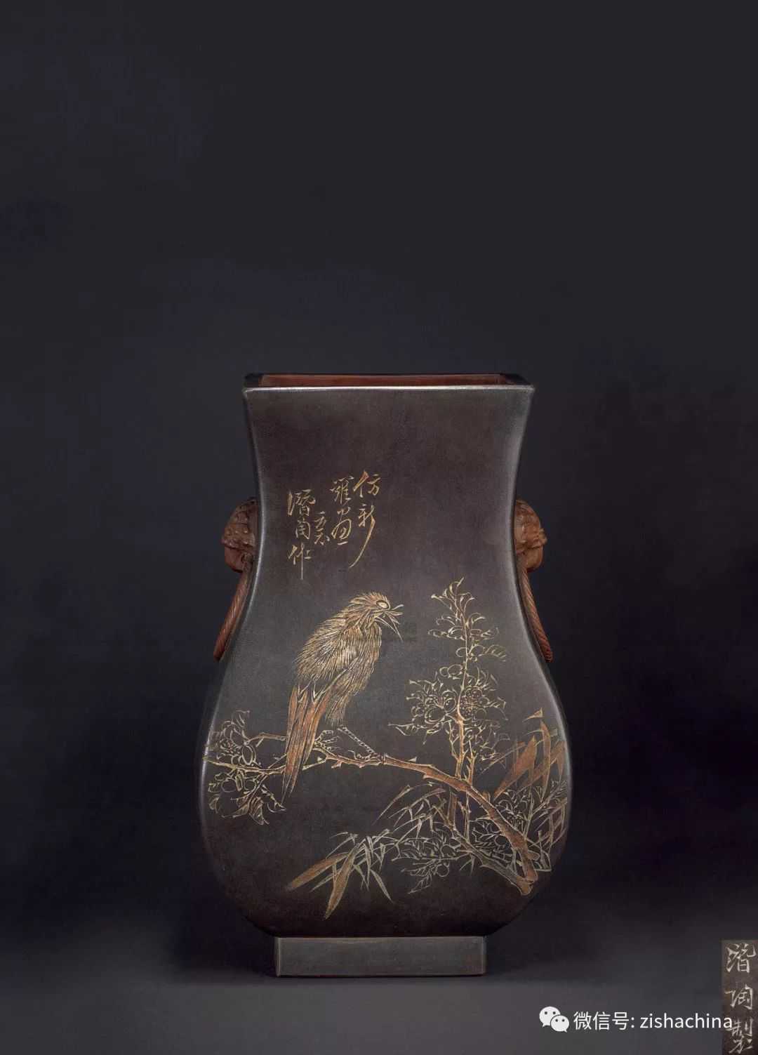 民国潜陶刻绘花鸟书法兽耳四方尊