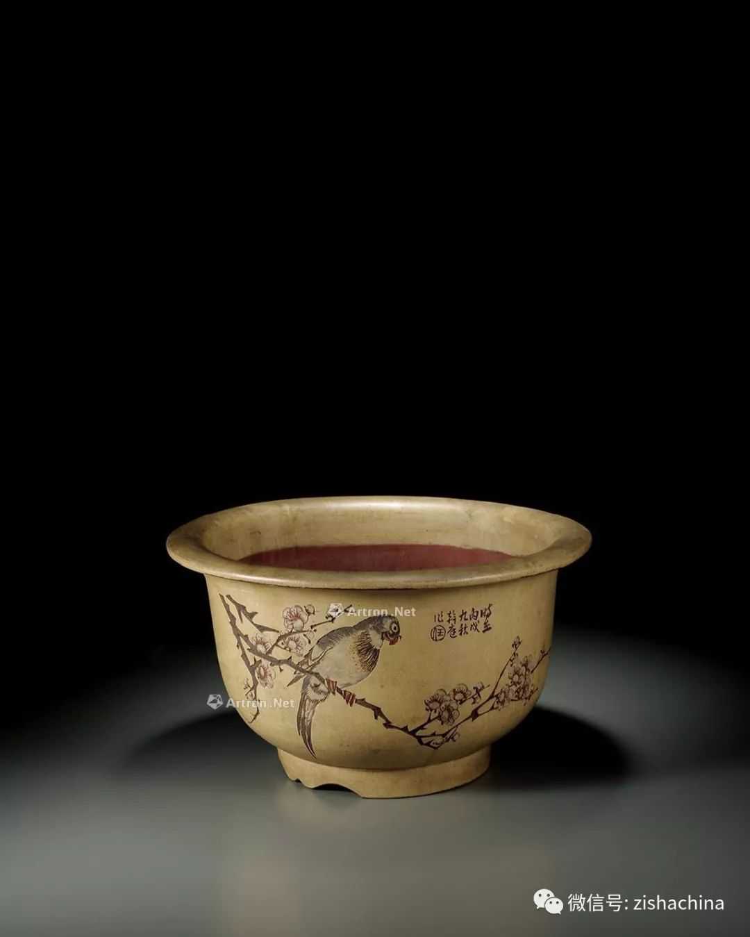 盆身外壁满刻装饰,一面由民国陶刻大师任淦庭刻喜鹊报春图并落款作铭,画面生动,色彩艳丽,寓意吉祥。另一面以隶书题刻诗句一首,皆以“春”为主题,与画面相互呼应。器表包浆莹润,古朴厚重。