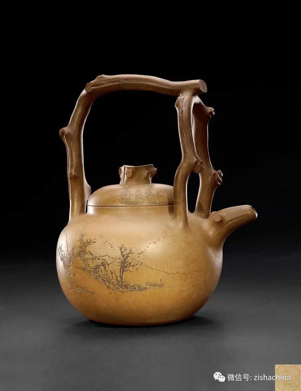 民国“星辰”款段泥刻山水东坡提梁壶