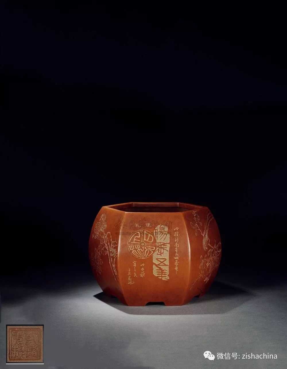 民国蒋荣熙刻花卉诗文六方仿古紫砂花盆