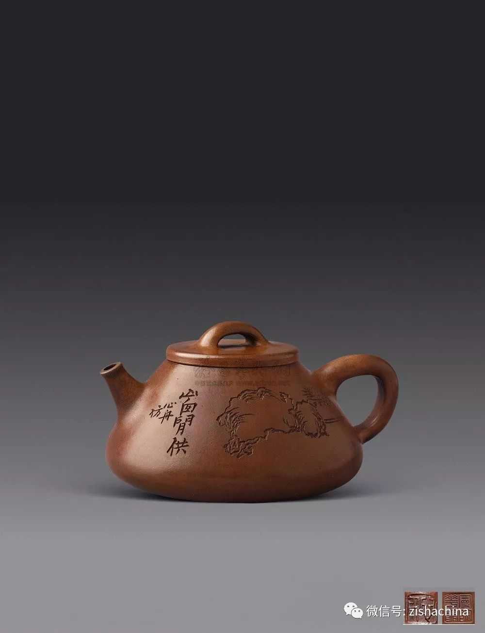 壶身两侧作书画装饰,一面线刻山水,另一侧篆题两字“珠圆”,并署“怀珠招凉从,壶公以相祥。铁画轩主人篆并刻之”。