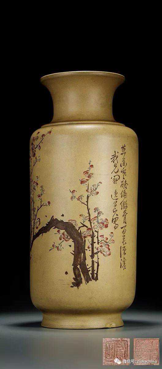 民国任淦庭、跂陶刻金鼎商标款紫泥粉浆赏瓶