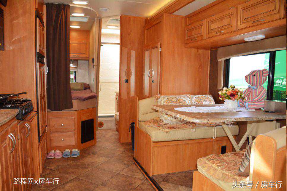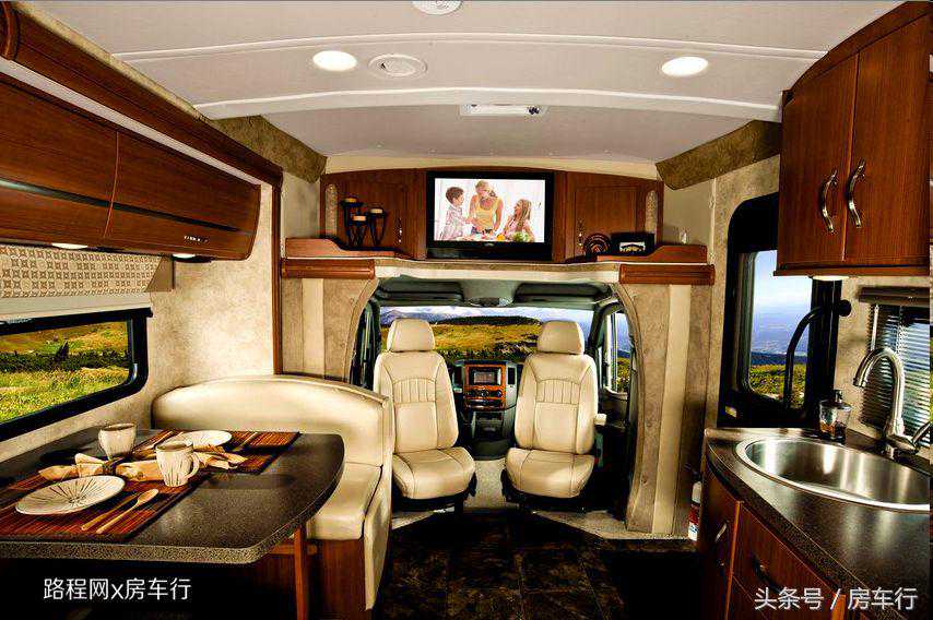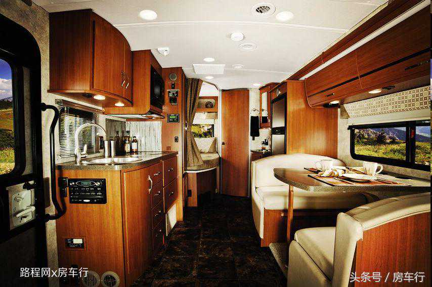 房车的内部构造是典型的美式风格,地板、家具以及墙面的配色相得益彰,看起来是一种干净简约却又不失格调的感觉。驾驶舱的主副驾驶座椅都可转到后方。四人对坐皮质沙发舒适度极高。