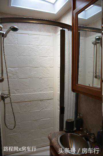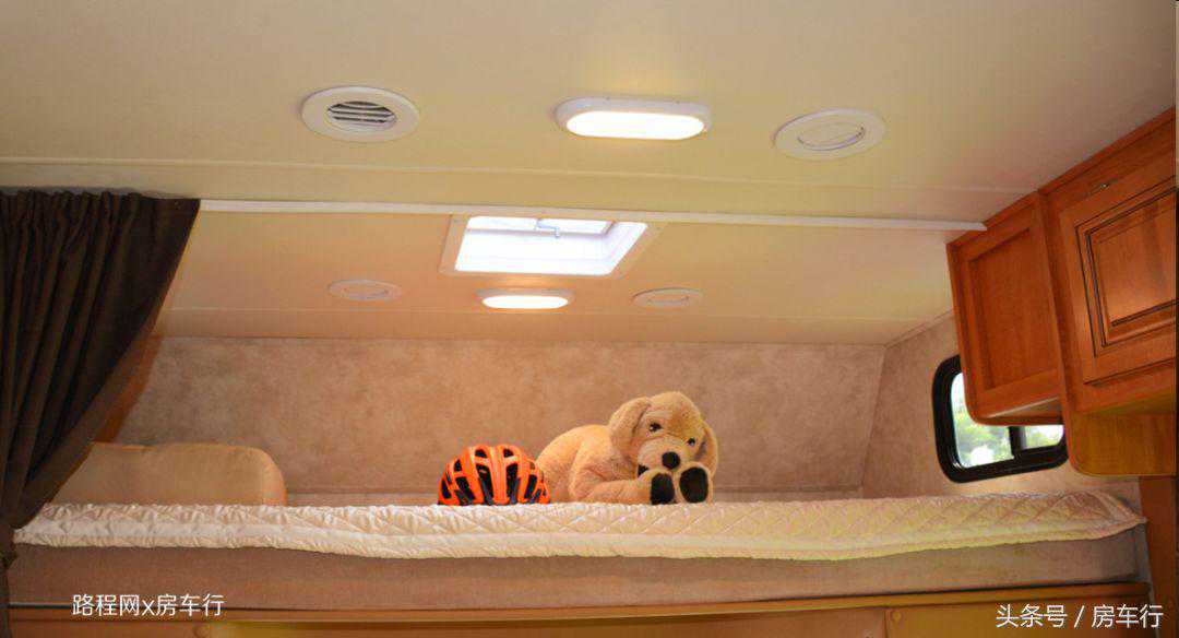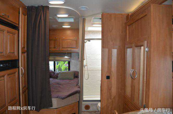 在车尾部是一张大的双人床,旁边还有储物柜,可以存放一些换洗的衣服。窗帘的隔断增加了私密性。